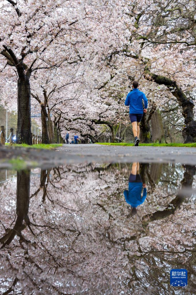 9月14日,一名男子在新西兰克赖斯特彻奇开满樱花的路上跑步。