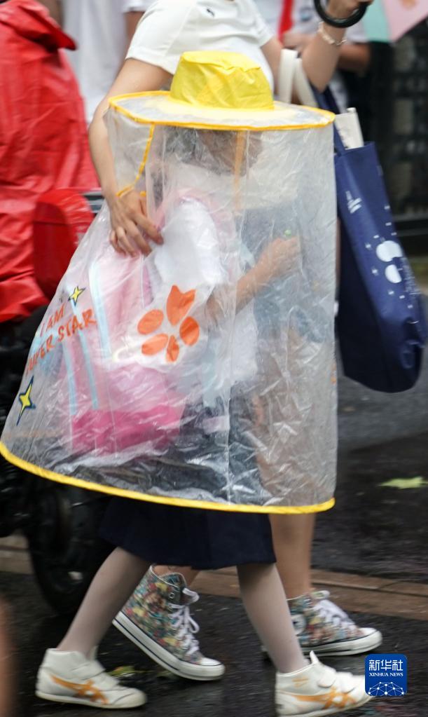 9月13日,上海市黄浦区巨鹿路第一小学的学生穿戴防雨装备放学。