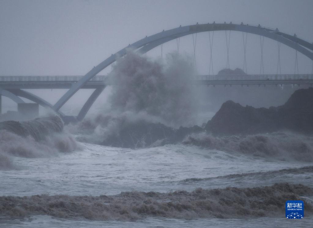 受台风“灿都”影响,浙江舟山朱家尖东沙景区附近的海面上风急浪大(9月13日摄)。