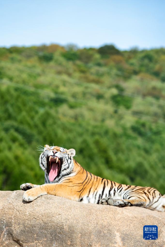 9月15日,在位于黑龙江省海林市的横道河子东北虎林园内,一只东北虎在石头上“打哈欠”。