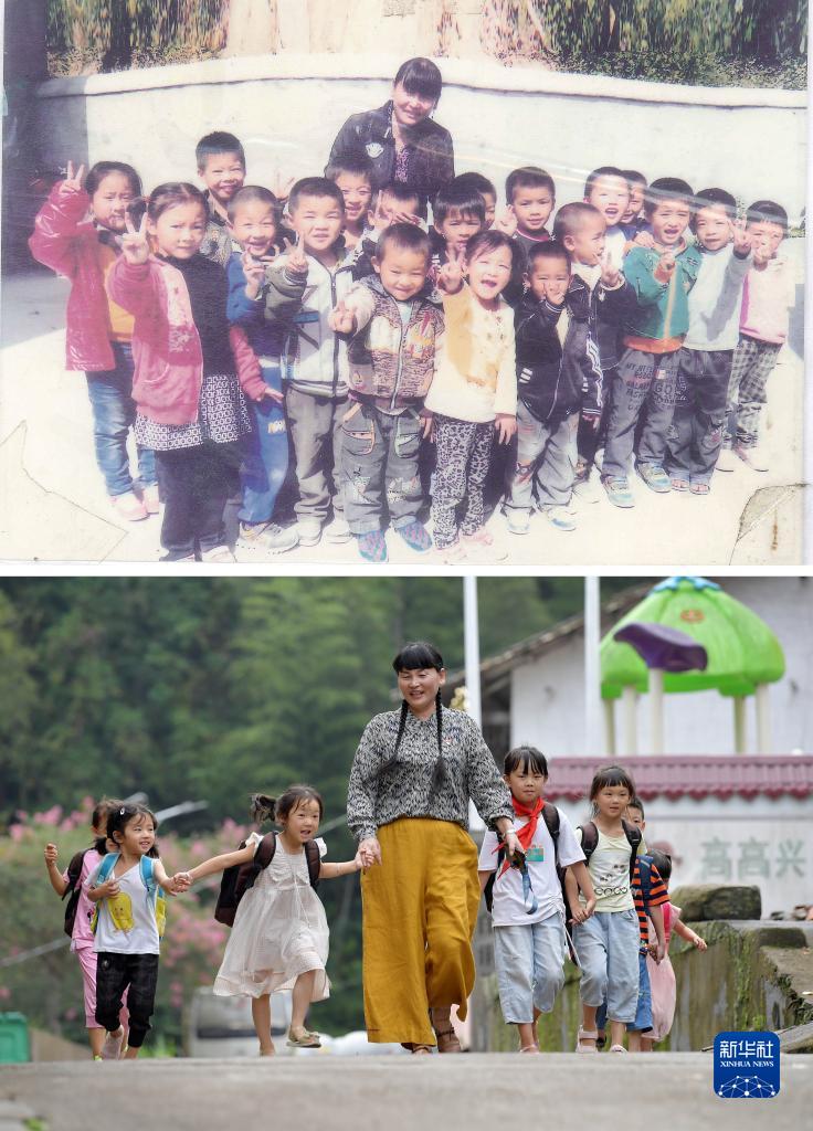 拼版照片:上图为支月英年轻时和学生们的合影(资料照片);下图为2021年9月2日,在江西奉新县澡下镇白洋教学点外,支月英送放学的学生们回家(新华社记者彭昭之摄)。