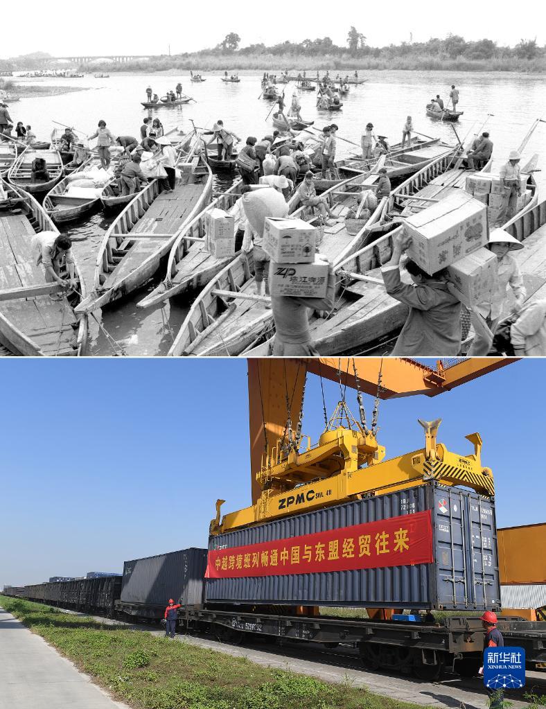 这是一张拼版照片。上图:90年代初在广西东兴北仑河上来往于中越之间运载贸易货物的船只(资料照片,新华社记者邓亚平摄);下图:2020年11月11日,在广西南宁国际铁路港,工人在吊装中越跨境班列货物集装箱(新华社记者陆波岸摄)。