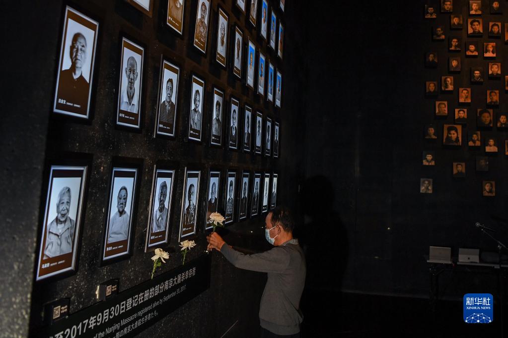 9月18日,在侵华日军南京大屠杀遇难同胞纪念馆,李如富老人的亲属在亲人遗像前献花悼念。新华社记者 李博 摄