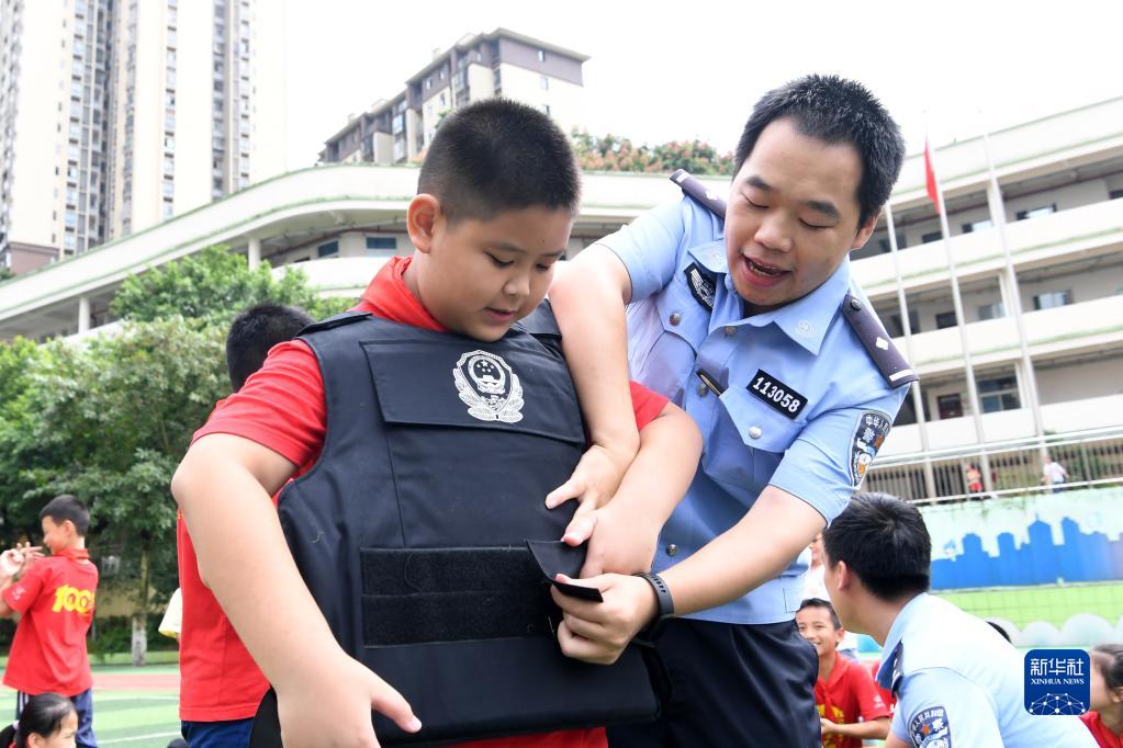 9月18日,小学生在民警的指导下体验穿戴装备。