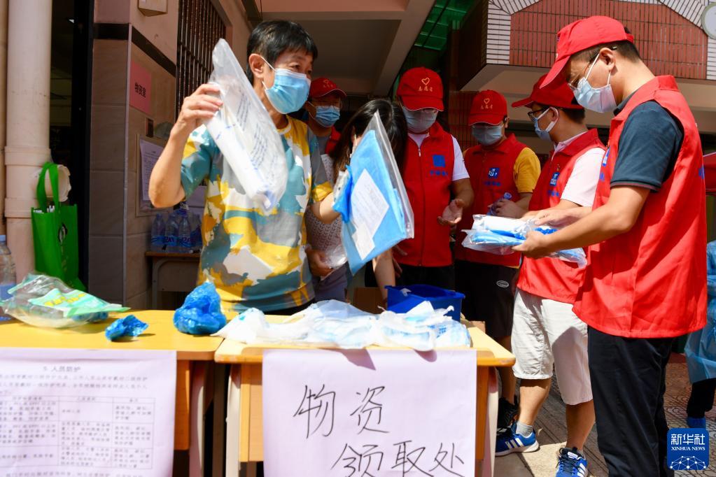 9月19日,在厦门松柏中学核酸检测点,刚刚报到的志愿者在领取物资。
