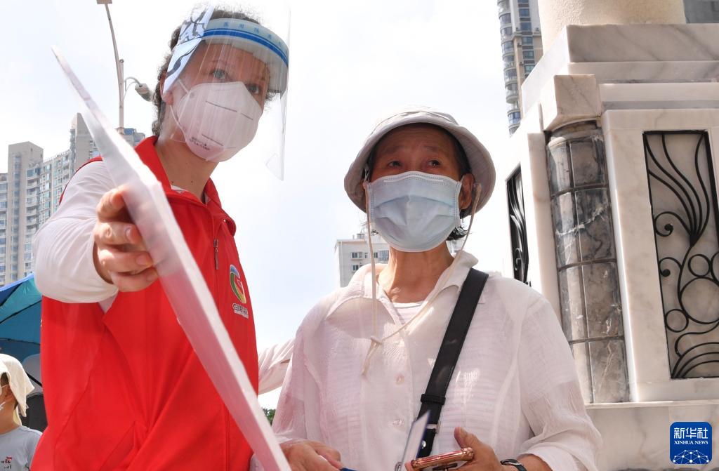 9月18日,在厦门海湾新城核酸检测点,来自捷克的志愿者潘淑娜(左)引导市民进行核酸检测取样。