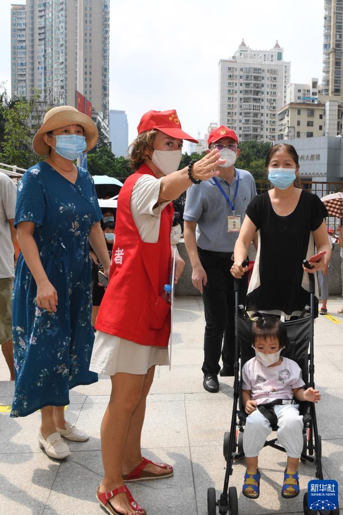9月18日,在厦门海湾新城核酸检测点,来自塞尔维亚的志愿者安娜(左二)引导市民进行核酸检测取样。