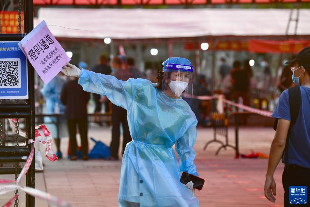 9月18日,在厦门五一文化广场核酸检测点,社区志愿者吴文谅引导居民进行核酸检测取样。