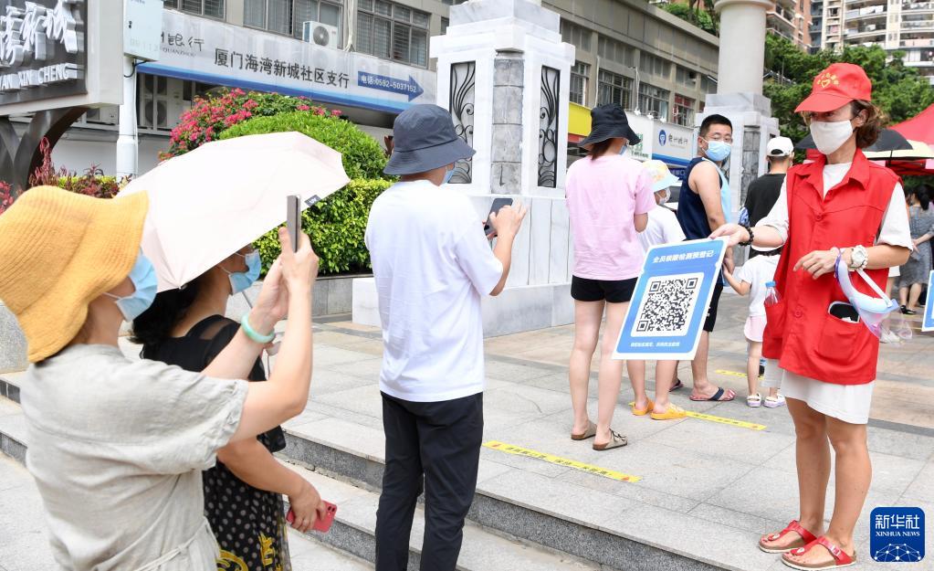 9月18日,在厦门海湾新城核酸检测点,来自塞尔维亚的志愿者安娜(右一)在协助市民进行核酸检测扫码登记。