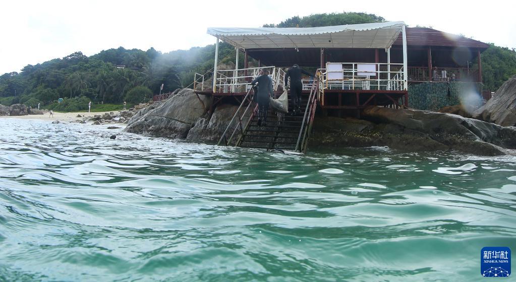 在海南三亚蜈支洲岛,工作人员将海洋中清理出来的垃圾搬运上岸(9月14日摄)。