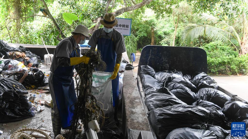 在海南三亚蜈支洲岛旅游区的垃圾中转站,工作人员将运送过来的垃圾进行分类打包,准备外运处理(9月14日摄)。