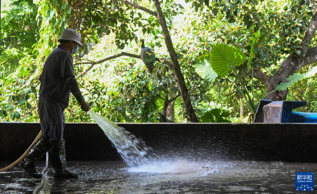 在海南三亚蜈支洲岛旅游区的垃圾中转站,工作人员处理完垃圾后清洗中转站(9月14日摄)。