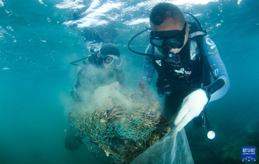 在海南三亚蜈支洲岛海域,工作人员在海底将清理出来的渔网装入垃圾袋(9月14日摄)。
