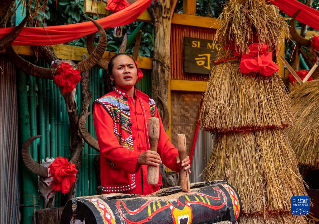 9月19日,在云南民族村佤族寨内,一名佤族演员在敲木鼓。