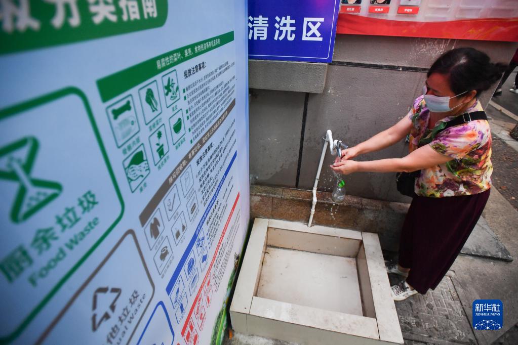 9月19日,在长沙市天心区狮子山社区石化厅宿舍生活垃圾集中投放点,居民在投放垃圾后洗手。