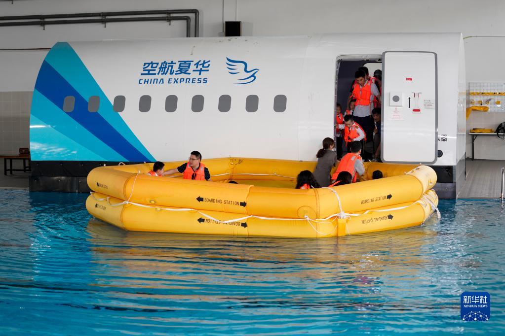 9月19日,亲子体验课上,参加课程的家庭在进行水上迫降应急撤离体验。