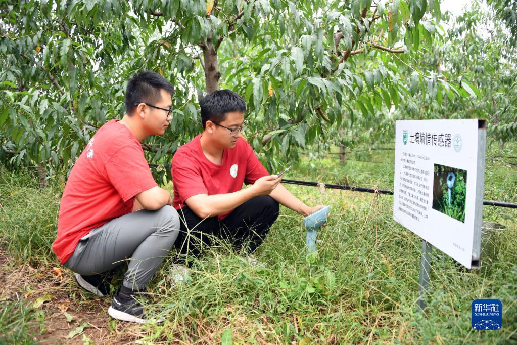 9月19日,在北京市平谷区峪口镇西营村“未来果园”,中国农业大学学生郝胜磊(左)与邵奇通过手机扫描土壤墒情传感器的实时数据。