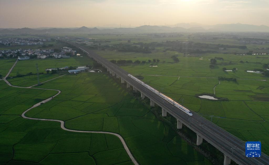 动车在广西宾阳县古辣镇的稻田间驶过(无人机照片,9月19日摄)。