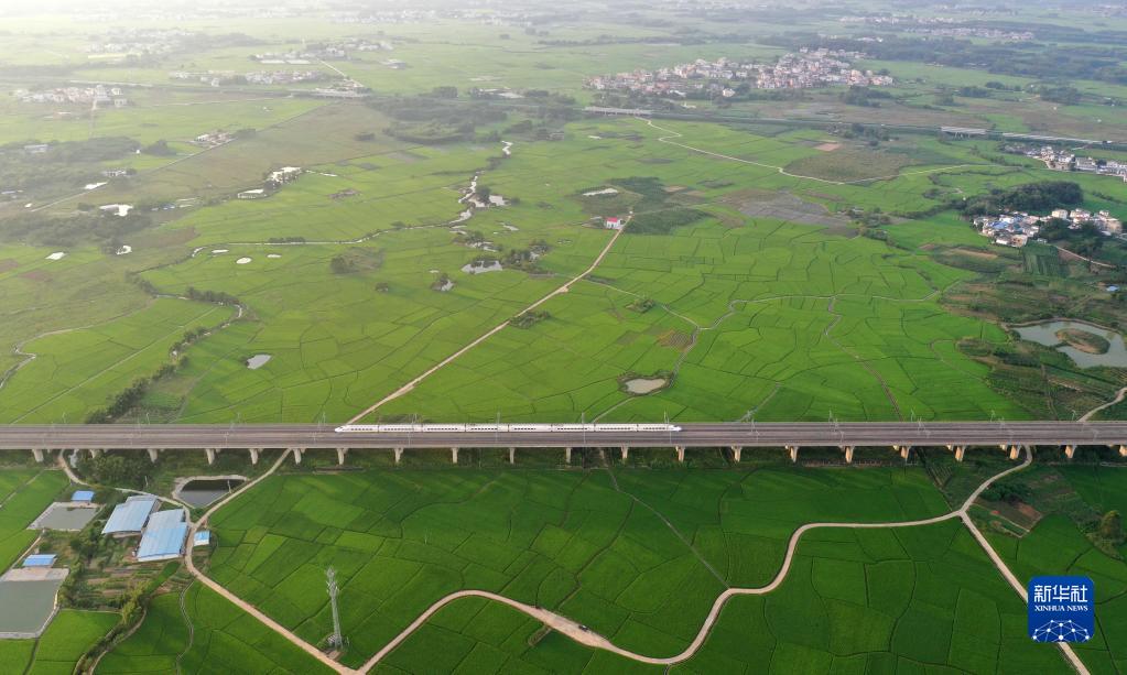 动车在广西宾阳县古辣镇的稻田间驶过(无人机照片,9月19日摄)。