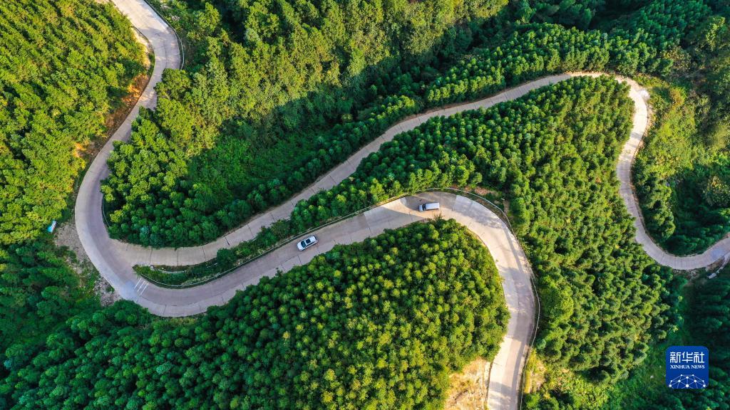 9月18日,常宁市塔山瑶族乡公益电影放映队队员开着流动放映车前往东江村(无人机照片)。