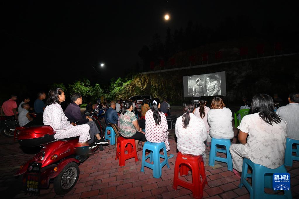 9月18日,在常宁市塔山瑶族乡东江村,村民在观看公益露天电影。