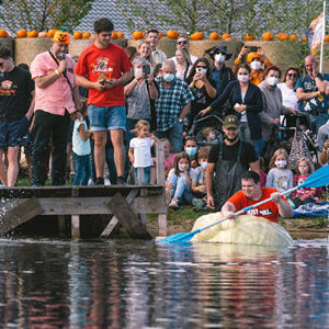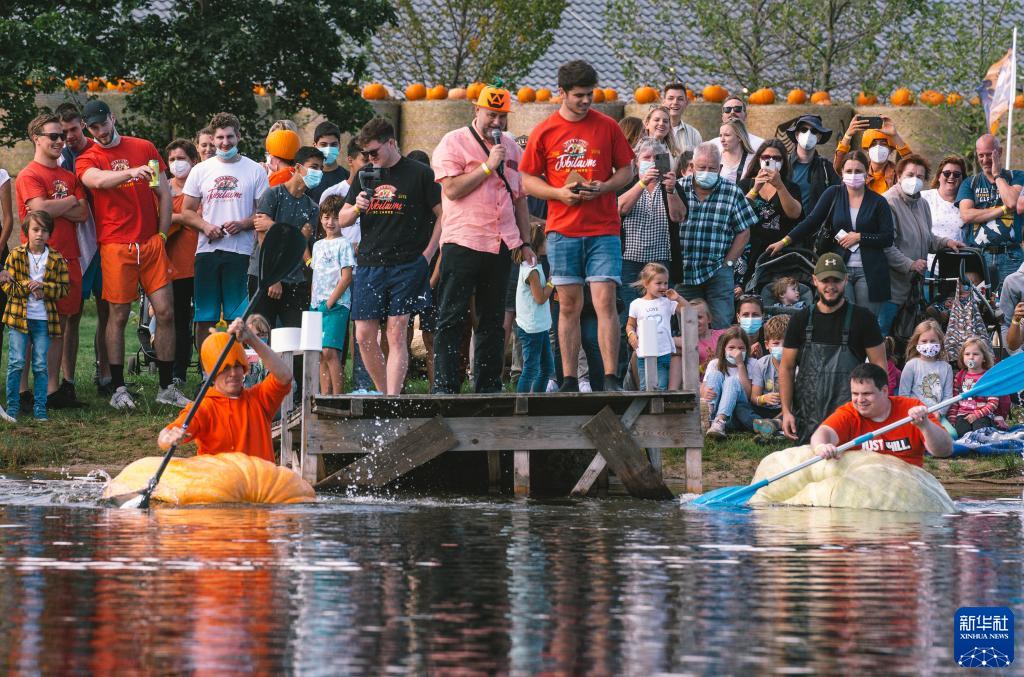 当日,一场趣味“南瓜船”比赛在德国科隆市附近的梅谢尼希镇举行。选手们将被挖空的巨型南瓜当做小船,用桨划水前行。据悉,为庆祝南瓜丰收,德国科隆市附近一农庄举办传统南瓜节,期间举办南瓜趣味称重比赛、“南瓜船”比赛以及南瓜雕塑展等活动,吸引民众前来参观游玩。