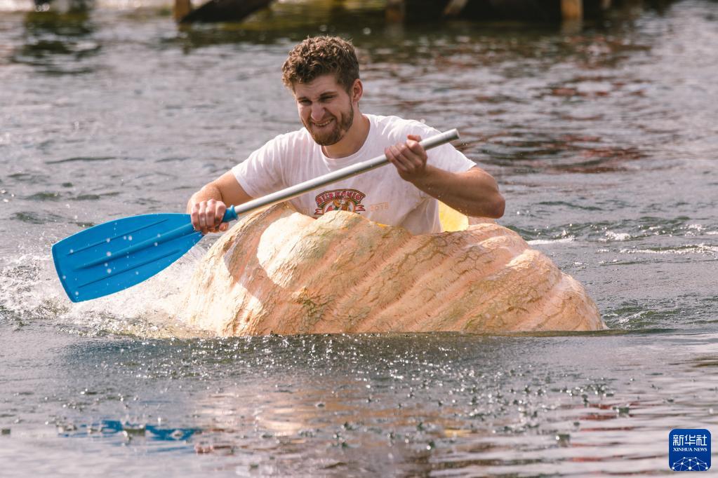 当日,一场趣味“南瓜船”比赛在德国科隆市附近的梅谢尼希镇举行。选手们将被挖空的巨型南瓜当做小船,用桨划水前行。据悉,为庆祝南瓜丰收,德国科隆市附近一农庄举办传统南瓜节,期间举办南瓜趣味称重比赛、“南瓜船”比赛以及南瓜雕塑展等活动,吸引民众前来参观游玩。