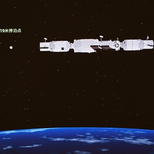 9月20日在北京航天飞行控制中心大屏拍摄的天舟三号货运飞船与在轨运行的空间站组合体交会对接。新华社发(郭中正 摄)