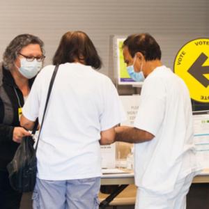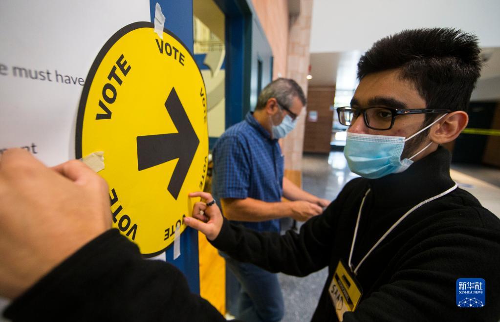 9月20日,工作人员在加拿大安大略省米西索加一处投票站外张贴投票方向箭头标识。