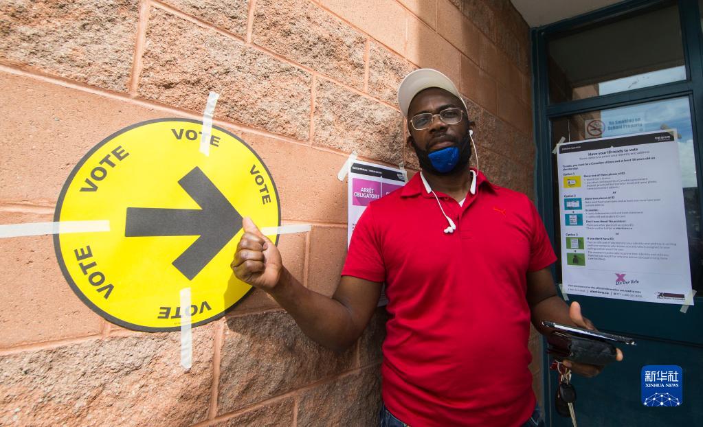 9月20日,一名选民投票后在加拿大安大略省米西索加一处投票站外留影。