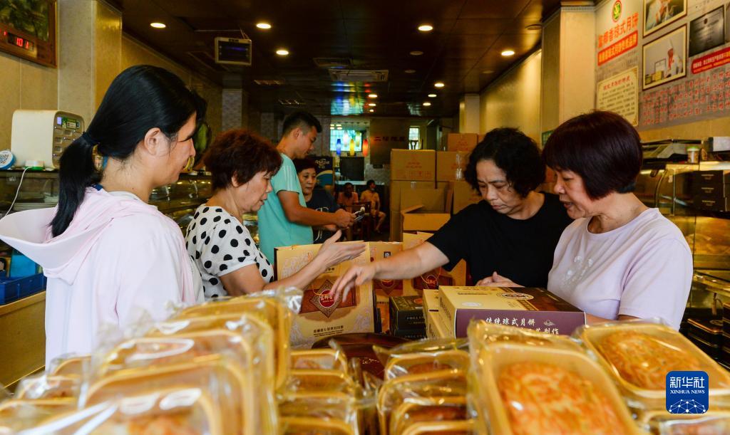 中秋佳节到来,人们在海口街头购买琼式月饼庆中秋。海南本土琼式月饼以低糖、低脂、饼皮酥香松软为特点,深受喜爱。