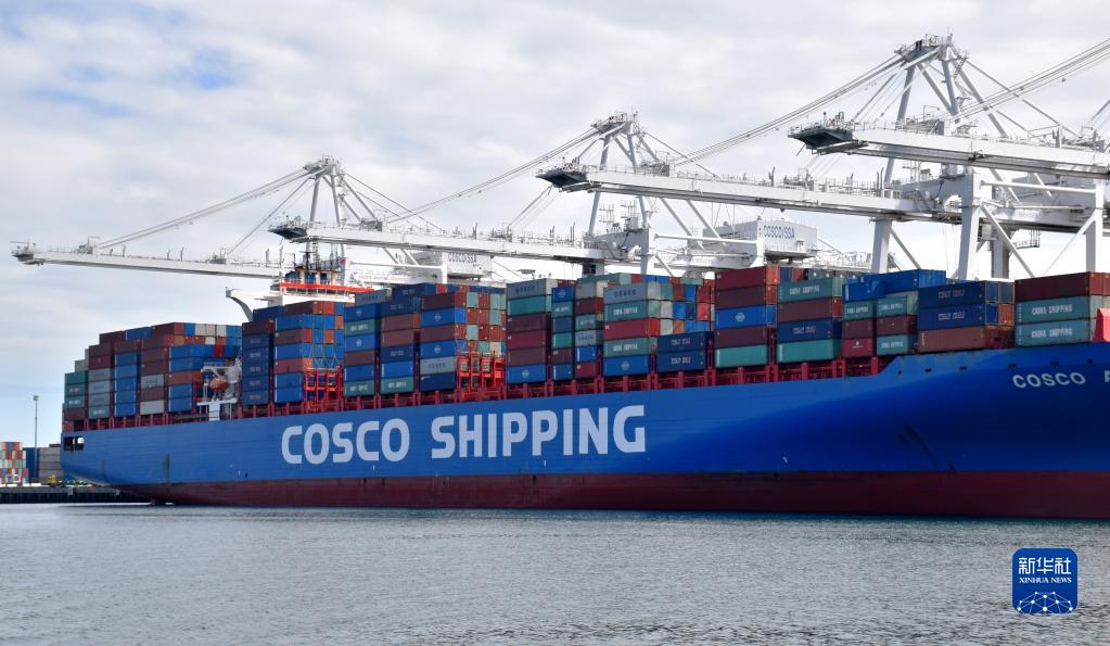 这是2019年2月27日在长滩港拍摄的一艘中国远洋运输集团(COSCO)的集装箱货轮。