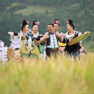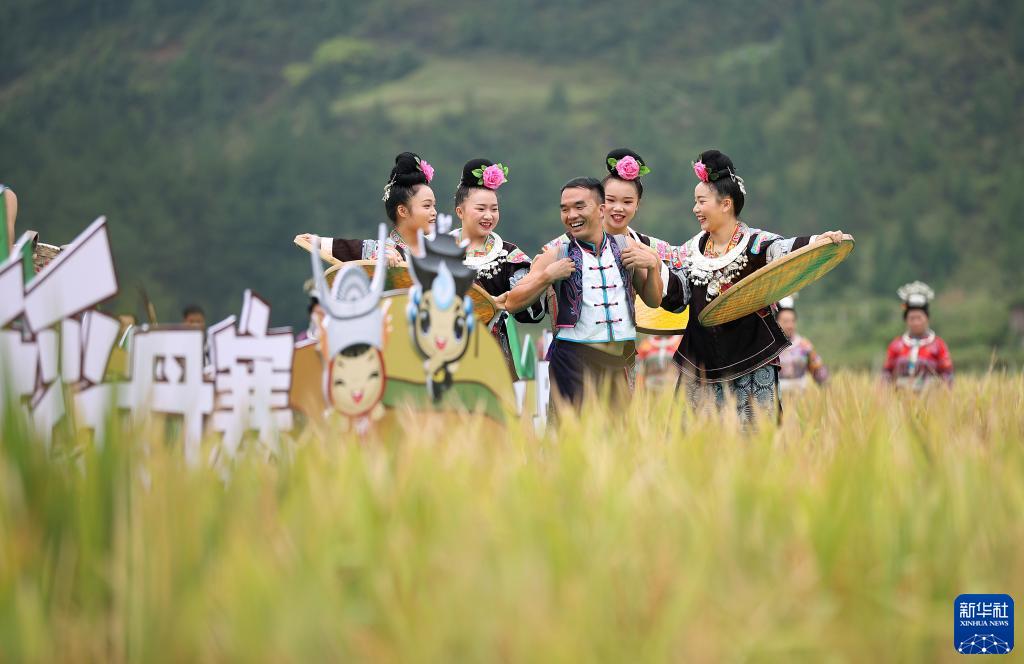 9月19日,在贵州省丹寨县龙泉镇卡拉村,演员在稻田里表演丰收舞。