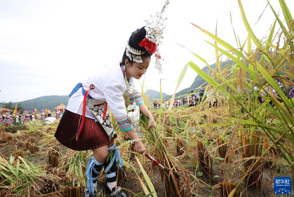 9月19日,在贵州省丹寨县龙泉镇卡拉村,一名少数民族装扮的游客在稻田里体验收割的乐趣。