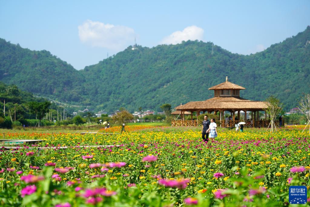 9月21日,在浙江省乐清市清江镇一个农业观光园,游客在花海中休闲。