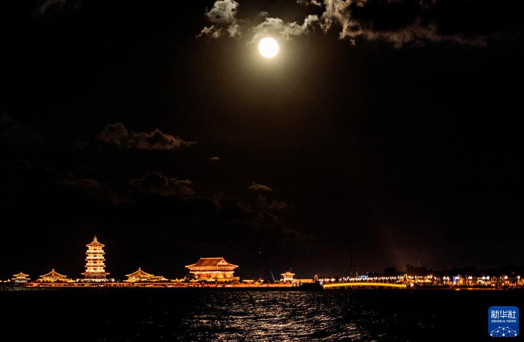 9月21日在山东省烟台市蓬莱区海滨拍摄的圆月。