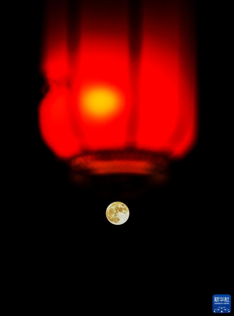 9月21日在贵州省黔东南苗族侗族自治州丹寨县拍摄的仿古灯笼和圆月。