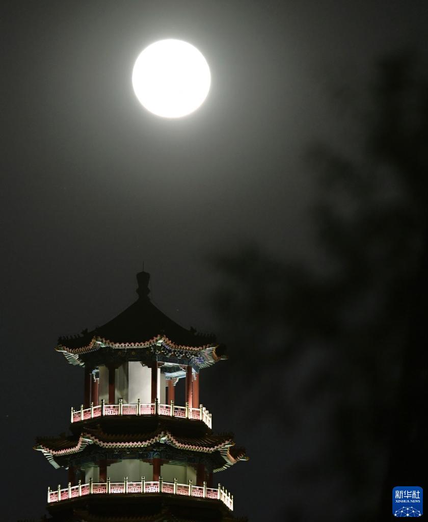 这是在北京石景山拍摄的功亭阁和圆月(9月21日摄)。