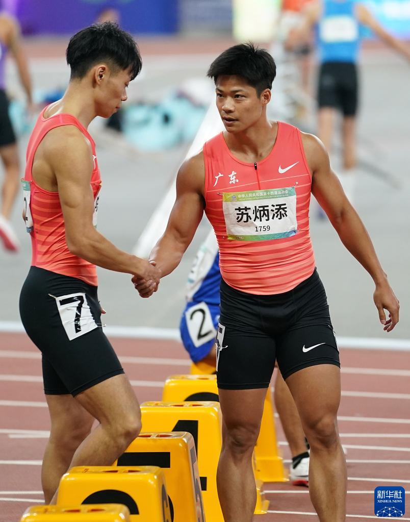 9月21日,广东队选手苏炳添(右)赛后与队友陈冠锋握手致意。苏炳添以9秒95的成绩夺得冠军。
