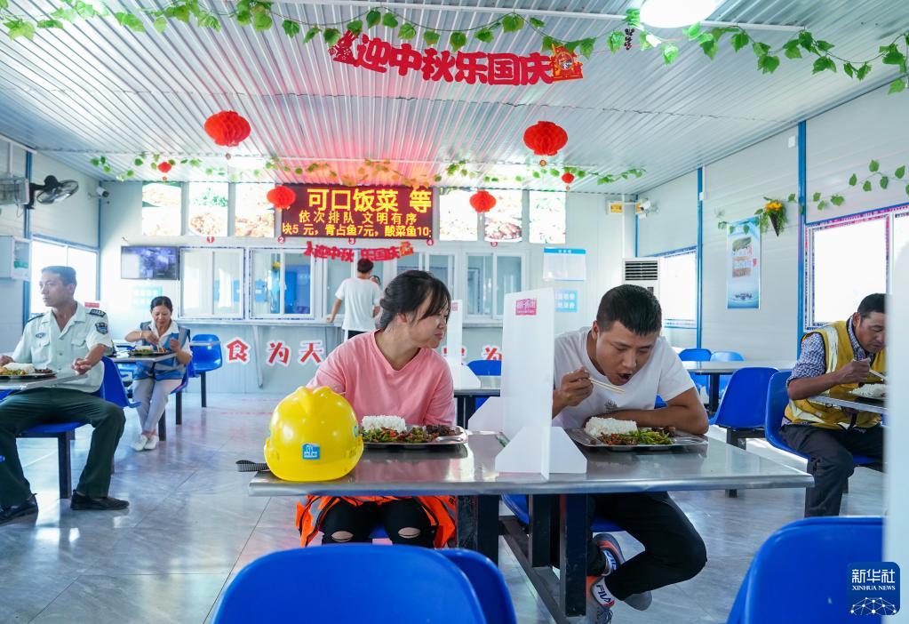 9月21日,在中建三局华东公司上海分公司的某项目工地上,工人郎晓蓉(前左)与丈夫傅辉(前右)在食堂内用餐。今年,他们在上海过中秋。新华社记者 丁汀 摄