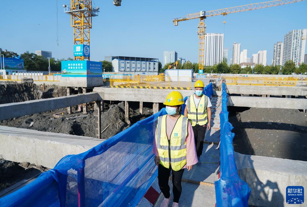 9月21日,工人郎晓蓉(前)与丈夫傅辉在中建三局华东公司上海分公司的某项目工地内。今年,他们在上海过中秋。新华社记者 丁汀 摄
