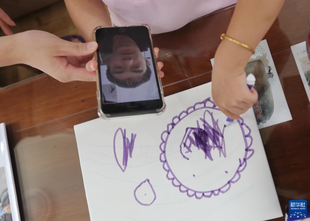 9月20日,上海市兴业中学援滇支教教师周华的女儿在上海家中给爸爸直播“左手画月饼”。新华社记者 刘颖 摄