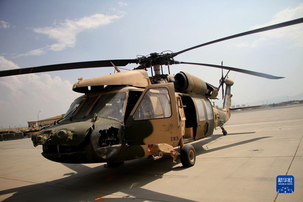 这是9月20日在阿富汗喀布尔机场拍摄的被毁坏的阿富汗空军直升机。