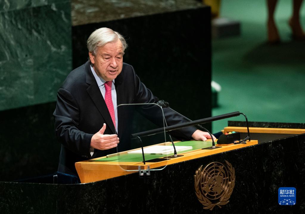 9月21日,在位于纽约的联合国总部,联合国秘书长古特雷斯在第76届联合国大会一般性辩论开幕式上致辞。