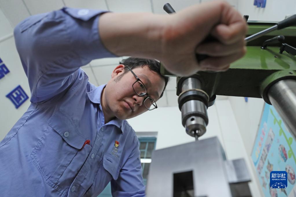 航空工业沈阳飞机工业(集团)有限公司首席技能专家方文墨在方文墨工作室打磨零件(2021年4月12日摄)。
