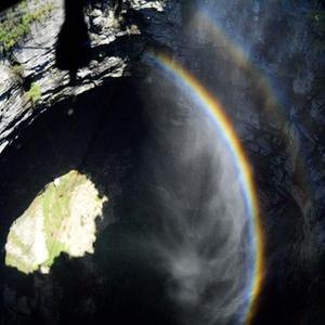 在鄂西山区的宣恩县矅天眼景区,瀑布从锣圈岩天坑上空飞流而下,在半空形成水雾,天气晴好时,阳光照射天坑,时常可见“天坑彩虹”景观。