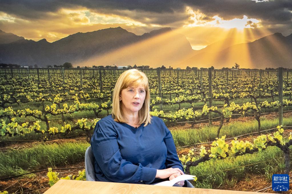 9月21日,在南非斯泰伦博斯,南非葡萄酒业协会首席执行官茜奥班·汤普森在协会总部会议室的背景墙前接受新华社记者专访。