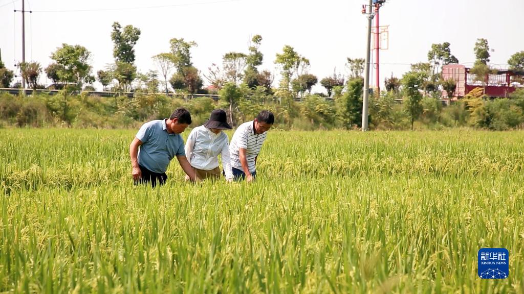 9月17日,在湖南省汨罗市汨罗镇江景村的稻田里,种粮大户曾岳华(左)与两位农业技术人员查看优质稻“泰优390”结实率。