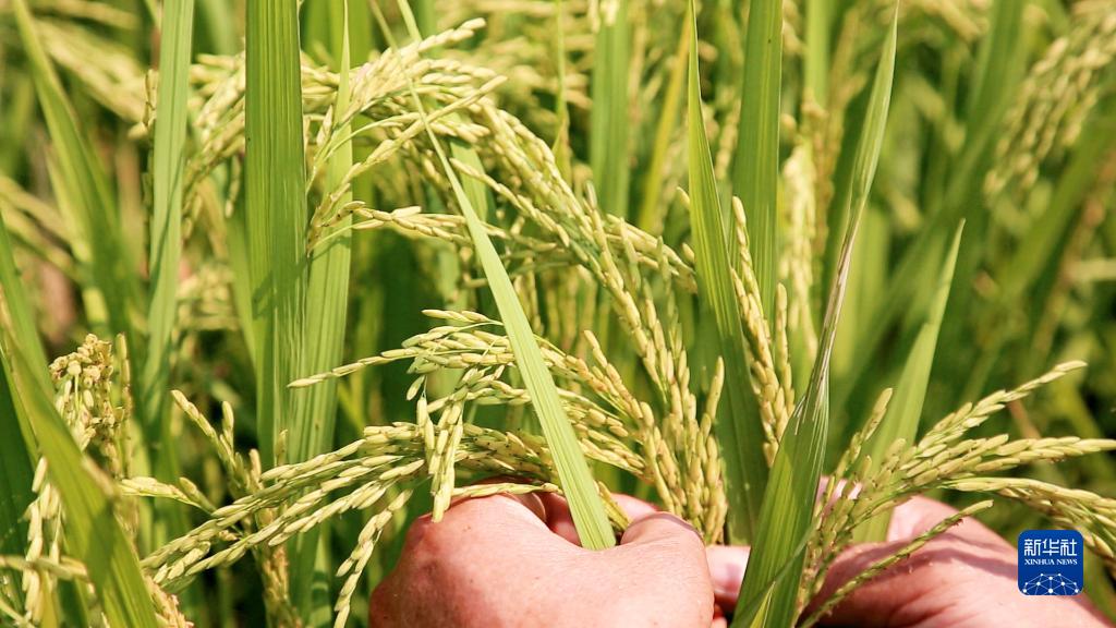 在湖南省汨罗市汨罗镇江景村的稻田里,种粮大户曾岳华查看优质稻“泰优390”的结实率(9月17日摄)。
