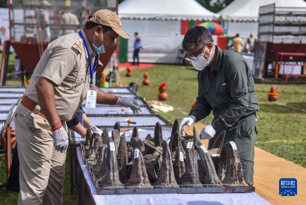 9月22日,在印度阿萨姆邦戈拉卡德地区,工作人员展示即将被销毁的犀牛角。